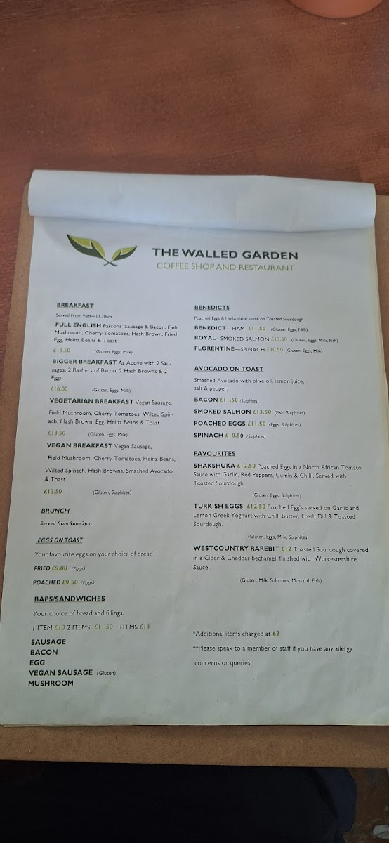 The menu at The Walled Garden offers a straightforward selection of comforting British and European café-style dishes, perfect for relaxed meals throughout the day. Whether you're stopping by for a leisurely breakfast or a satisfying Sunday lunch, the choices cater to a variety of tastes while blending seamlessly with the warm, inviting atmosphere of the café.